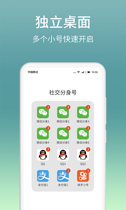 微分身双开软件是一款可以支持在一部手机上同时开启多个分身的软件,每个分身均可以自己定义图标,每个分身的内容、以及个人隐私的数据也是完全独立的,图标可随时隐藏,也不用担心个人征信和封号的问题,随开随用。非常方便!