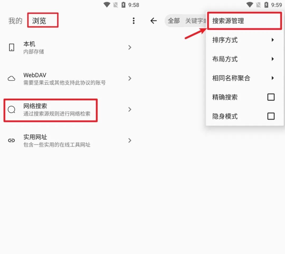 1、首次打开软件默认是一个空壳软件,里面是什么资源都没有的,我们需要手动操作一下,操作教程也非常简单的,我们只需要点击软件主界面的浏览菜单,然后点击网络搜索,然后依次点击右上角的搜索源管理!