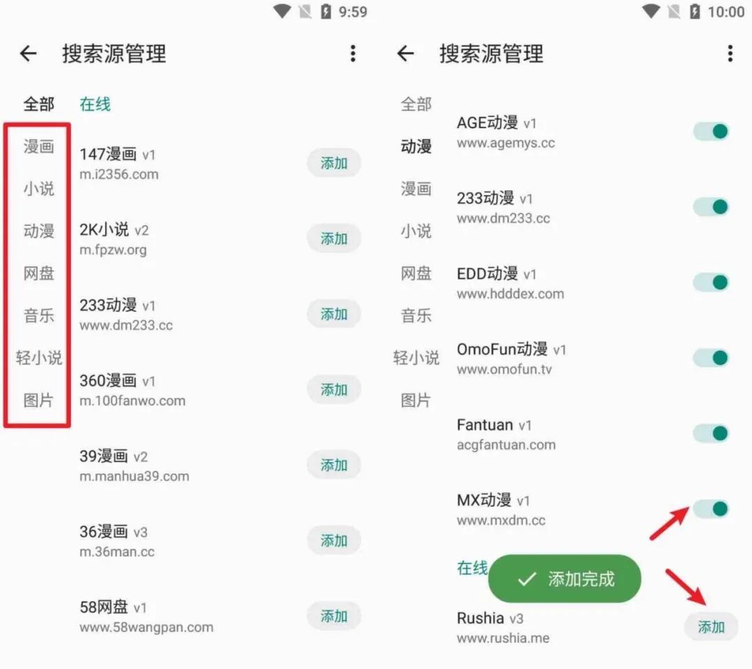 2、在这里大家就会看到软件中内置了非常多的资源站,包含了漫画、小说、动漫、音乐、网盘搜索、轻小说等等,大家需要做的就是点击后面的添加按钮即可,添加的资源站越多软件中的资源就越丰富哦!