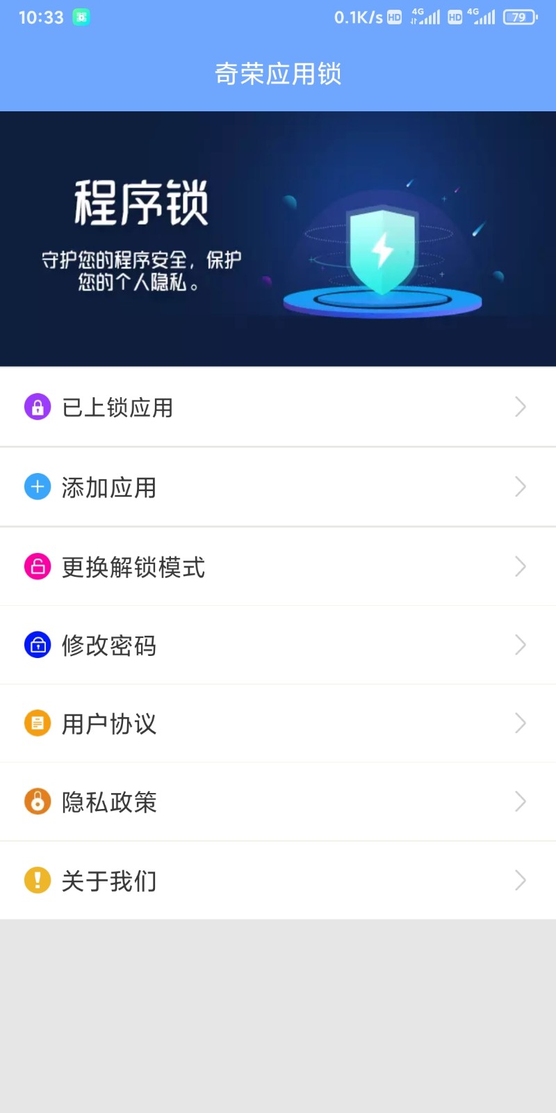 奇荣应用锁APP是一款非常可靠的加密软件可以帮助用户们对手机上的信息进行加密,确保大家的隐私安全不被侵犯,可以自己自定义事件跟密码等,支持一键锁屏功能,欢迎大家来下载试试吧。