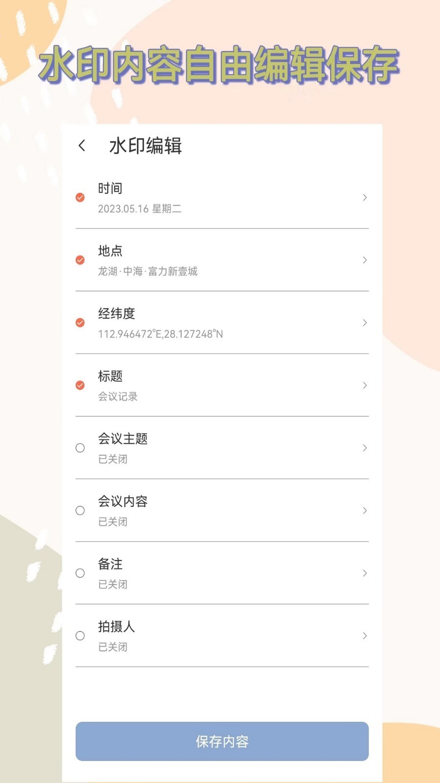 3、自定义水印:水印上内容选项自由开关,自由添加水印内容行数、修改颜色、添加图片logo