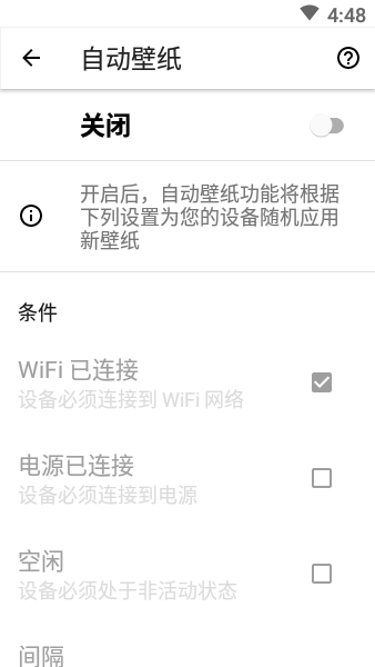 4、对于图片壁纸更新问题,在左下方菜单栏--自动壁纸中,先开启该功能,WIFI连接勾选,之后大家就可以根据时间间隔”来进行设置了,短到15分组,长到一天、一周和一个月,都可以。