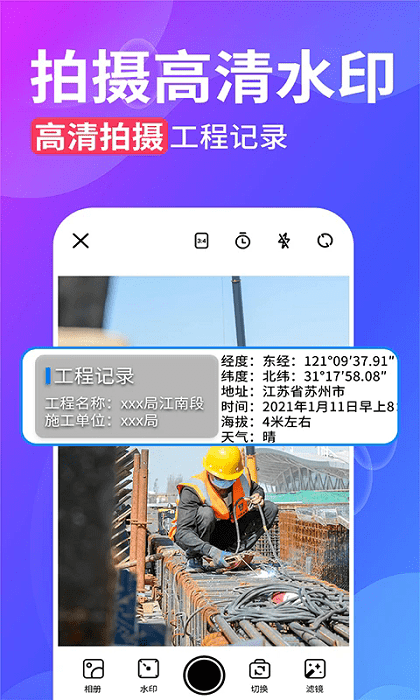 2.工程水印:用于记录工程工作的专用水印,记录工程所在地位置,记录工程内容,一键使用,方便省心
