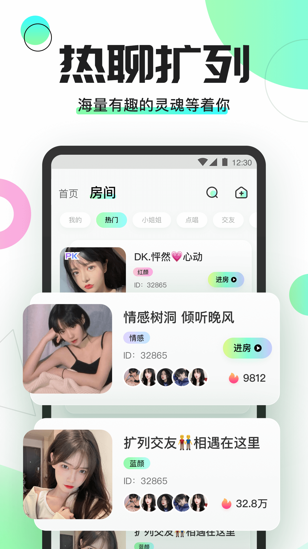3、多人语音聊天室:在线点单、K歌点唱、相亲交友、温馨电台…不同的声音汇聚一起,玩出无穷乐趣!