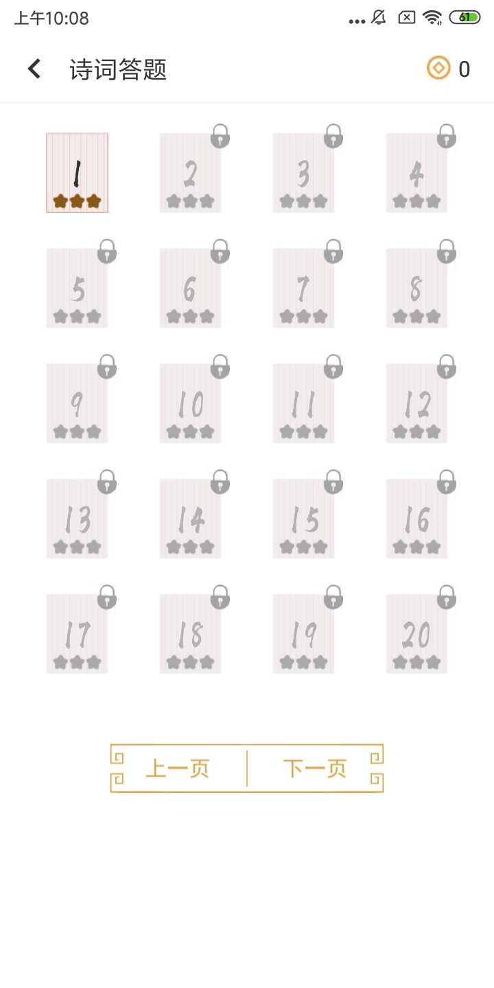 4、诗词答题:收集了1000多首中国古诗题材,题型多样有趣,其中包括选择题、填字题、看图猜诗句、识别诗句等,适合全国中小学生及高中生的学习教材。欢迎来挑战你的大脑极限。通过答题闯关方式,从此学习古诗词不枯燥。
