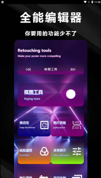 1、海报制作:为用户提供了海报制作所需的一切工具,包括设计模板,文字、图片编辑器等功能;