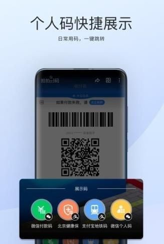 2、拍拍扫码app还集成了生活中大多数场景的展示码,如健康宝、付款码、公交地铁码、和个人名片码。