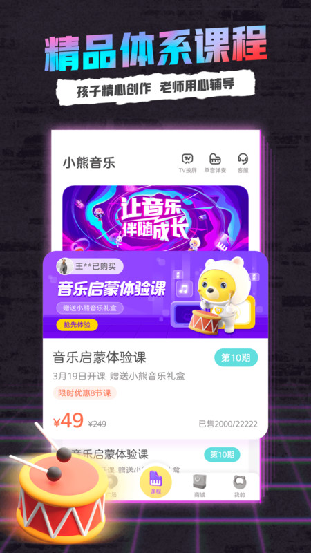 小熊音乐课程值得买吗?小熊音乐是一款非常不错的音乐启蒙教学平台,在这里有非常专业的教学老师线上一对一辅助学习,以及特色AI识别互动技术,让孩子可以更加融入到教学中,提高孩子兴趣,更高效的完成学习,拥有一个音乐技能。感兴趣的小伙伴们快来下载小熊音乐体验吧!