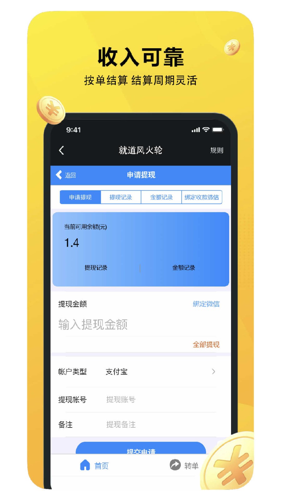 就道风火轮app是一款功能非常专业的外卖接单软件,为用户们提供专业靠谱的配送服务,这里的各种服务种类丰富,无论专业配送员还是兼职,都可以在这里找到的单子,这款软件最大特点就是不需要抢,系统会自动接收,再也不用担心手机网速慢抢不赢而苦恼了,感兴趣的用户快来下载试试看吧!