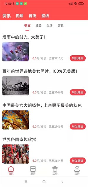 软件上更新了包括新闻、搞笑、美食等文章,转发至,好友点击就挣钱