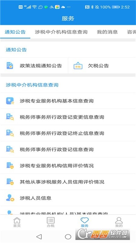 1、公众服务:查看办税日历、办税地址、办税指南、公告信息、税务法规等信息。