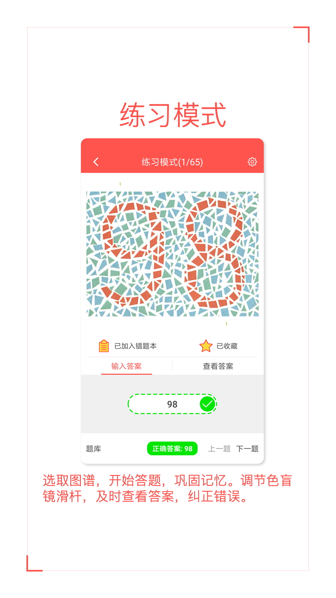 3、读图模式。选取特定图谱、按顺序浏览图谱和答案。通过色盲滤镜还原图谱真相。