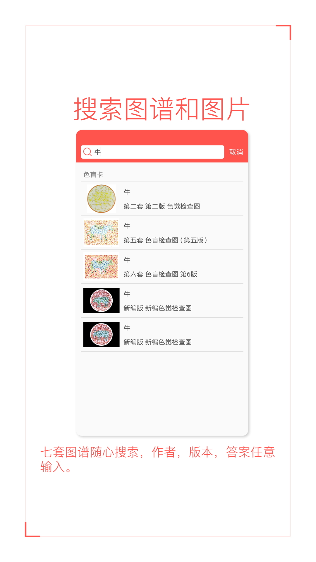 1、测试模式。从第五套图谱中随机从题库选取、测试辨色能力、测试结果中包含答案分析、结果更有对比性。