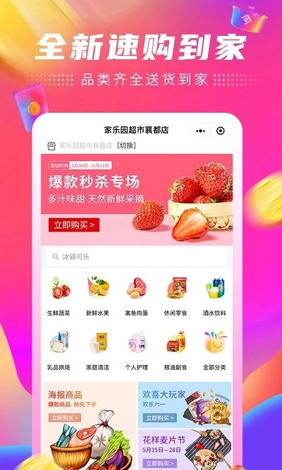 家乐园速购app手机版是一款购物软件,最大的特点就是很快,会根据商家的所在地筛选商家,提供同城购买服务,线上与线下相结合,配送快,物品质量有保障,支付简单,商品涵盖范围面广,喜欢的朋友就来下载体验吧!