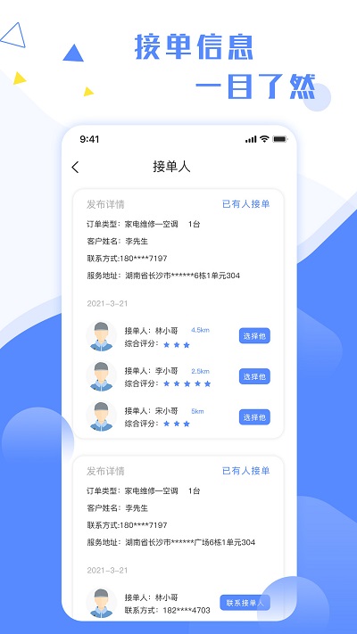 接单:根据坐标,就近“接单”就近服务,上门更及时,根据自己的所会的专业、能力,对照派单的距离、价值、有选择性的接单报价,操作简单:打开就可以对附近接单报价。