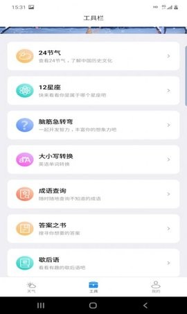 开言天气是一款非常好用的天气预报软件,这款软件的功能十分强大,不仅提供了当地和全球各地的天气情况,还拥有详细的天气变化监测和预测,让用户们可以轻松知晓天气的变化,从而提前预报,除此之外,软件内还有诸多的趣味小工具可以免费使用,有需要的朋友快来下载体验吧。