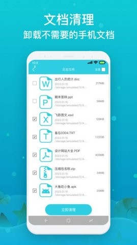 1、一键清理:清理手机内存,释放存储空间,提高手机运行速度