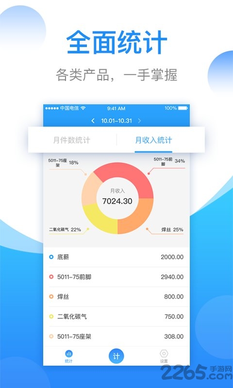 3、统计功能:靓丽的统计页面,用户可以通过饼图了解自己的收入分布。想知道自己每日每月的收入情况,统计功能可以一目了然,对自己的收入了如指掌,也不用担心单位算错记错的情况,让自己的每一分汗水和努力都能得到回报。
