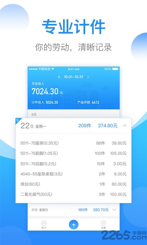 安心计件计算器软件录入产品/工序信息、工价后,每次记录只需录入做工件数,即可得出准确收入。将计件工作者记录的收入汇总、整理,2265用户既可以看到每日计件详细记录 ,也可以看到月汇总数据。