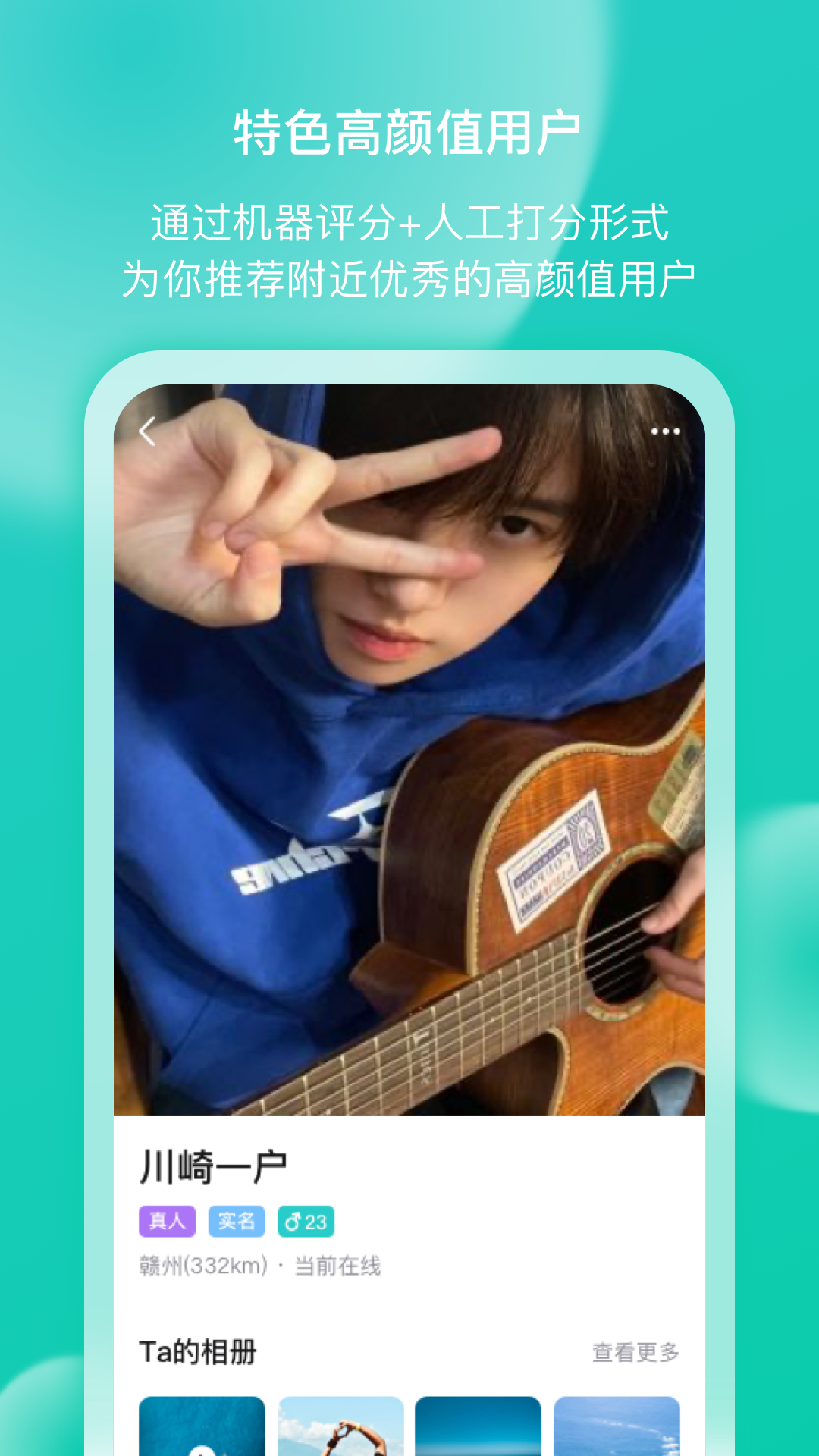 2、特色高颜值用户:通过机器评分+人工打分形式为你推荐附近优秀的高颜值用户
