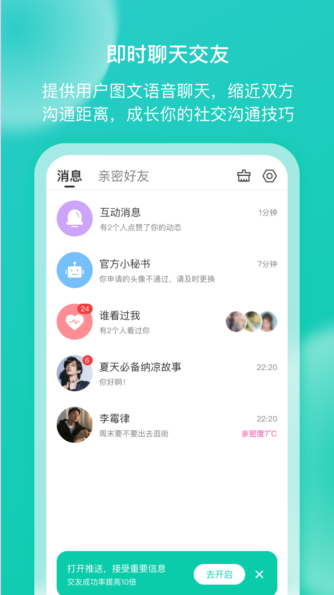 3、即时聊天交友:提供用户图文语音聊天,缩近双方沟通距离,成长你的社交沟通技巧