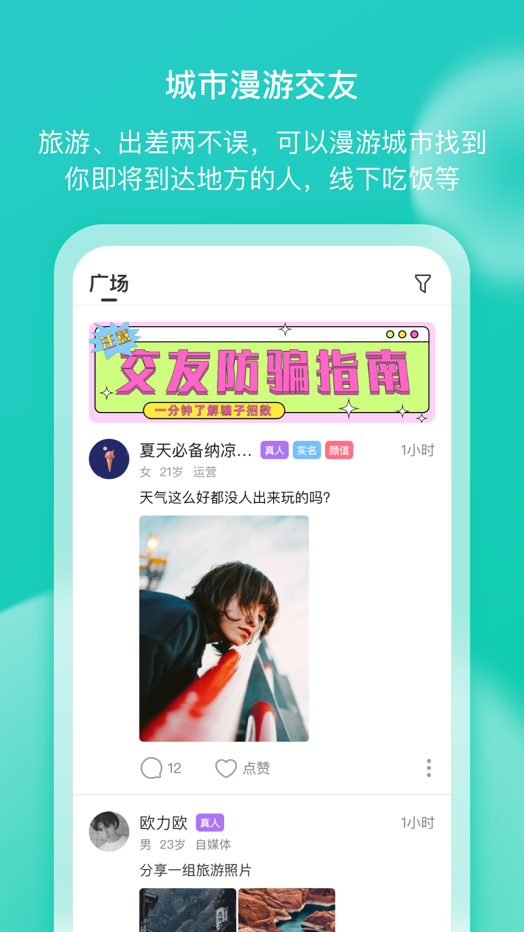 4、城市漫游交友:旅游.出差两不误,可以漫游城市找到你即将到达地方的人,线下吃饭等