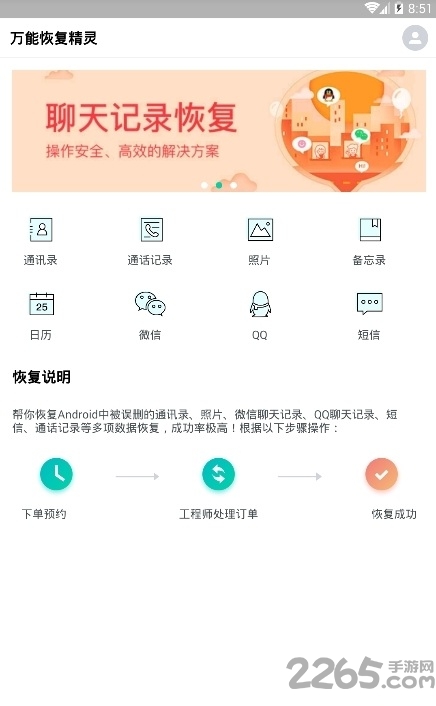 万能恢复精灵客户端是一款非常实用的数据恢复软件,各种照片、文件、短信一键恢复,界面清晰、操作简单、功能强大,为用户提供完美服务,有需要的话就来2265安卓网下载吧!
