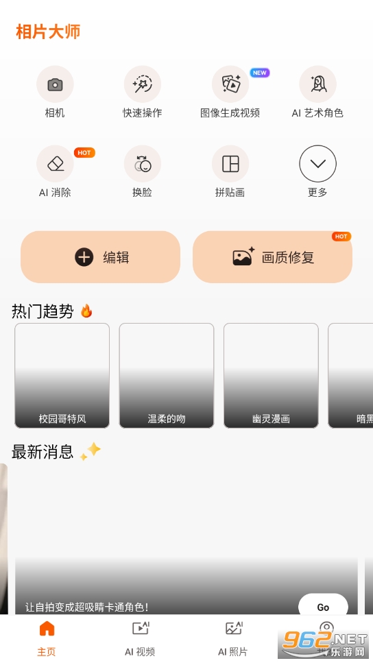 无论想要制作什么相片,都可以透过相片大师轻松完成!拥有这款简单操作的App,你将能轻松美化、编辑照片,并使用广受欢迎的相片动态特效!透过精确的编辑工具,进行光线与色彩调整、剪裁,或一键套用不同的滤镜与模板,快速为照片换成全新风格。
