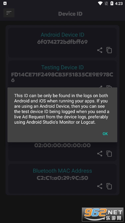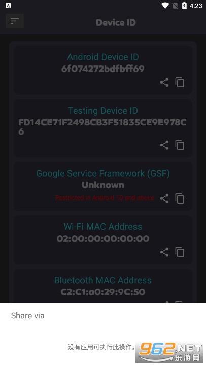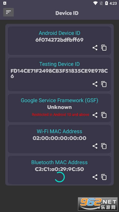 Device ID这款安卓ID查看器小东西是一个非常实用的一个东西,虽然有点时候用不着,但要用的时候,找的也比较辛苦。有了它我们就能在需要使用到这些设备号的时候,轻松查看到设备的各种ID和MAC地址之类的内容。