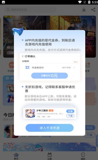 千寻手游是一款非常不错的专业的折扣手游平台,致力于为手游玩家提供最直接、最大力度的手游福利,不仅拥有海量低折扣游戏等你来玩,还有充值、返现、积分兑商品等福利,让你玩游戏更加实惠,并且每天平台都有丰厚的礼包和福利供你领取,感兴趣的用户快来下载体验吧!