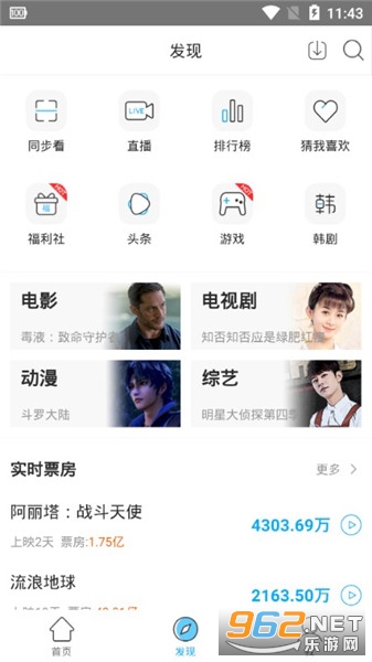 3、在发现中有详细的分类,有个实时票房,对于不知道看什么内容的小伙伴有更好的选择。