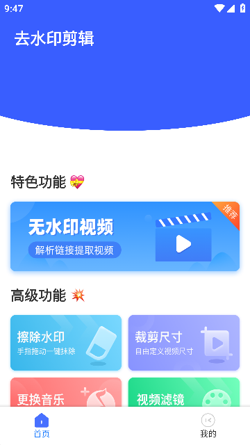 无水印剪辑视频去水印是一款全网无水印无版权视频软件。不管是图片还是视频都能快速祛除水印,同时支持自定义编辑视频内容,功能非常全面,实用便捷,一个软件轻松满足各种需求,大大提高办事效率,操作简单,有需要的小伙伴们快来下载体验吧!