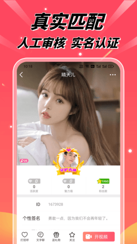 淘春视频聊天是一款优质的线上交友平台,这里拥有超多的帅哥和靓女,大家可以自由聊天,互相认识,每一位用户都是经过实名认证的真人,没有骗子和机器人,用户们可以放心畅聊,并且平台还会根据你的兴趣爱好等信息为你自动匹配异性好友,让你们拥有更多的话题,有兴趣的朋友快来下载体验吧。
