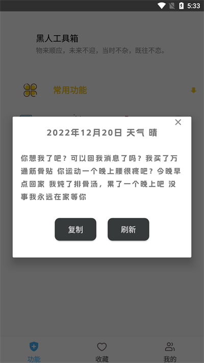 黑人工具箱软件是一款辅助工具非常齐全的app,各种滚动字幕,一键生成舔狗文案图片拼接等实用性功能多样,分类上也是非常详细的,不管是日常生活、学习还是工作中都是非常实用的,很好的满足不同人群的需求,都是免费的,有需要的小伙伴们快来下载体验吧!