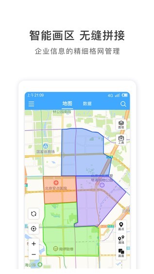 1、区划管理:业务片区可视化,可直接导入行政区划,或手动(沿道路)自由绘制区划,如物流配送区、销售片区等。