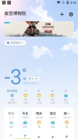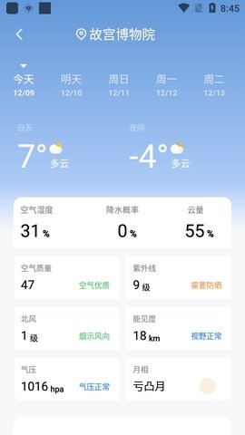 1、短期预报:准确及时地预测当前所在地的天气状况,从容应对每次出行。