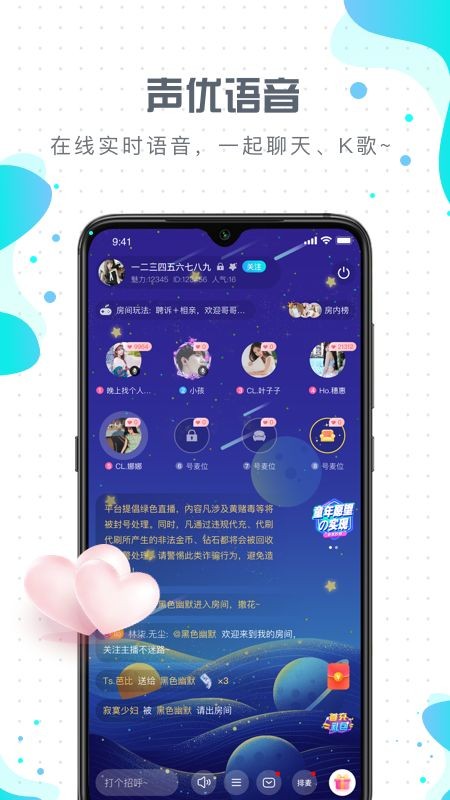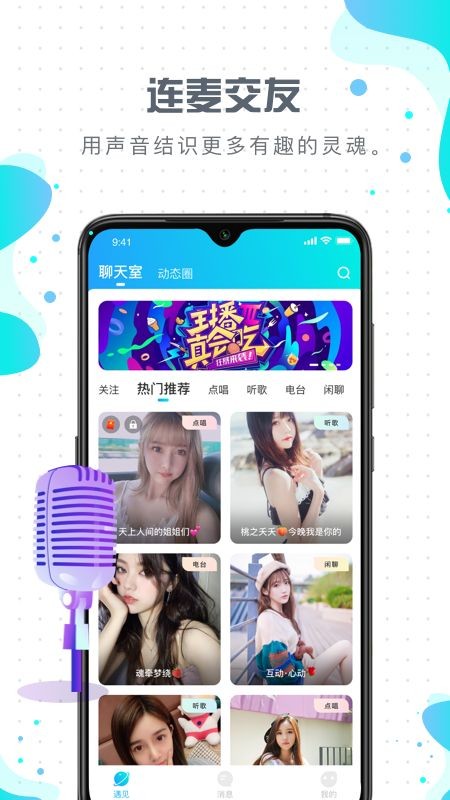 1、高质量连麦互动,少女音、御姐音、公子音、青叔音,喜欢声音更喜欢你。