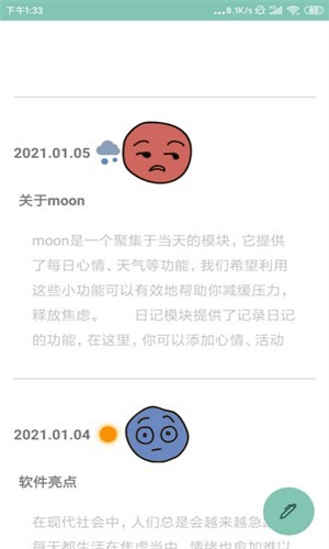 Moon心情日记app是一款记录生活心情的软件,用户可以在该平台内记录下自己的点点滴滴,会根据文字心情搭配各种可爱表情,帮助用户更好的解压、舒缓心情,布局十分简单,有需要的小伙伴们千万不要错过,快来下载体验吧!