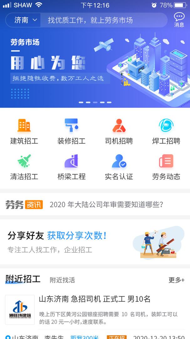 1、找活信息每天更新,根据工友设置的地域就近匹配