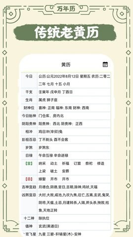 3、中华老日历是一款提供简洁实用的日历日期查询的app,包括吉日查询、财运日历、吉日查询等。