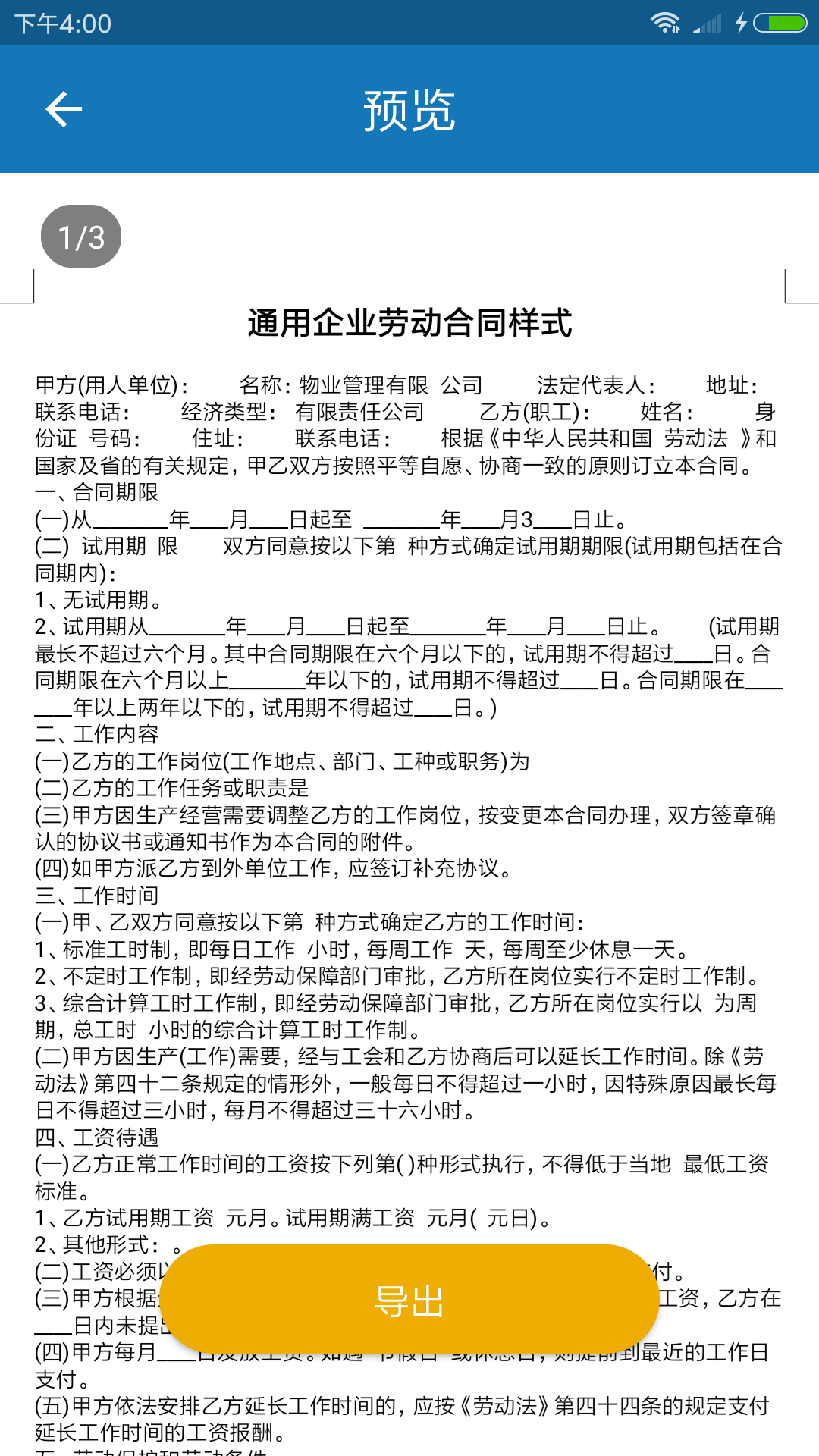 合同大全app是一款非常实用的办公软件助手,为广大用户提供了丰富的合同模板资源,行业分类详细,在这里您都可以免费下载使用,同时也可以在软件内在线制作合同,支持多种格式下载,非常实用,有需要的小伙伴们快来下载体验吧!