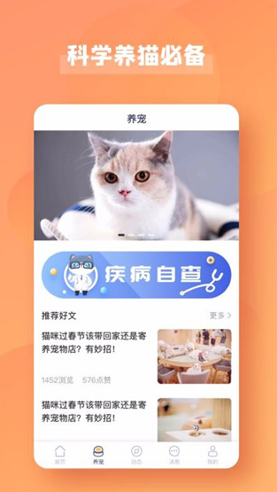 1、科学养猫必备知识随意学习,如经验交流、科普知识等,轻松掌握养猫的能力。