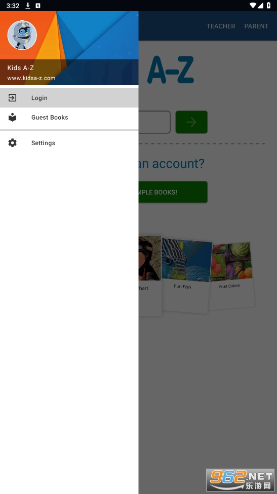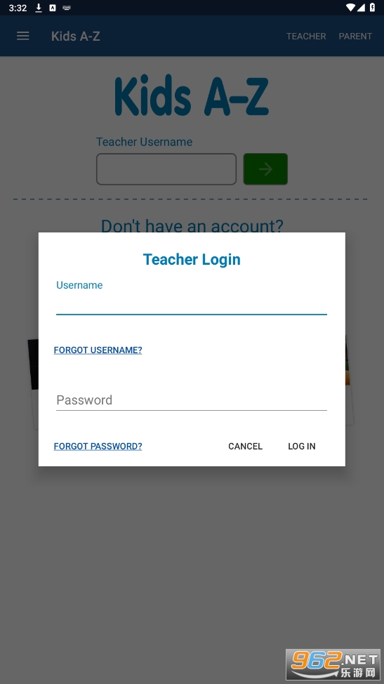 打开kids a-z app,点击右上角(教师点击teacher、家长点击parent)