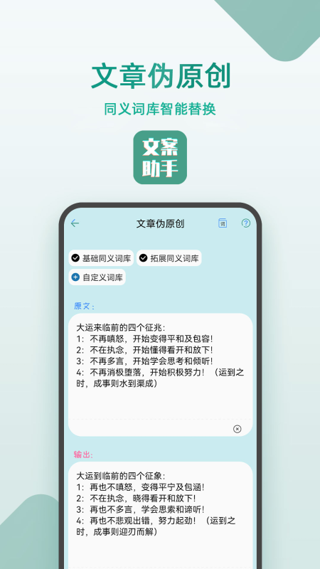 软件拥有基础同义词库”、拓展同义词库”,您还可以自主添加词库,通过词库为您一键生成伪原创文章;