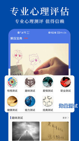 1、心理体检:在减压书里,你可以通过免费的专业心理测评,最简单、科学、快捷地了解自己的心理健康状况。