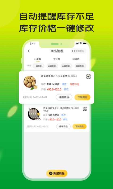 手机端随时登陆,商品上架、客户沟通,订单统计更加便捷,自动建立经营数据账本,让管理更加省时、省心、高效。