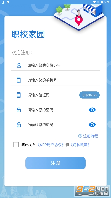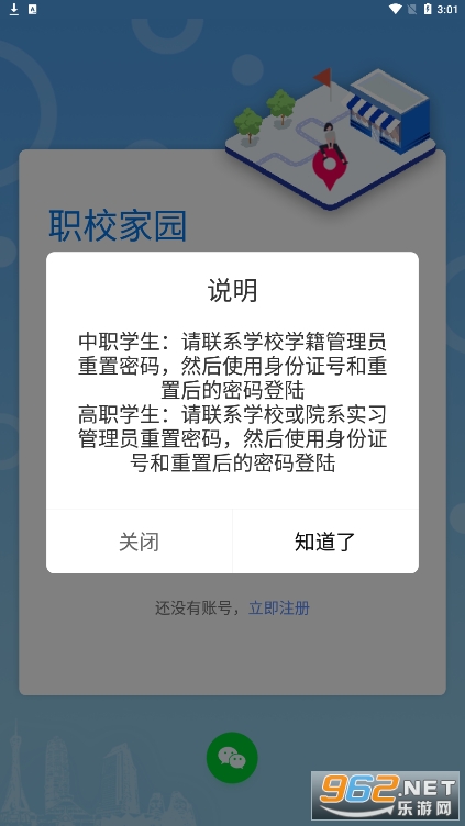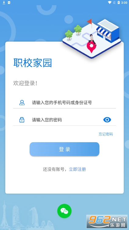 在手机上打开职校家园app,在app登录界面里,点击立即注册。