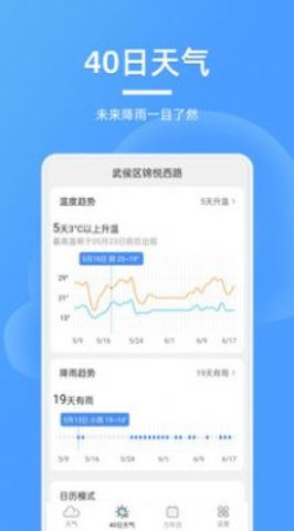 1、40日温度趋势和降雨趋势,支持日历模式查看降雨信息和天气详情