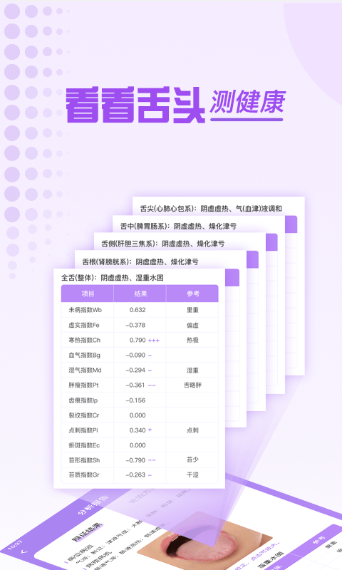 会自动的为用户剖析舌头的健康情况,依据舌头外表的各种现象来进行十分有效的判断。