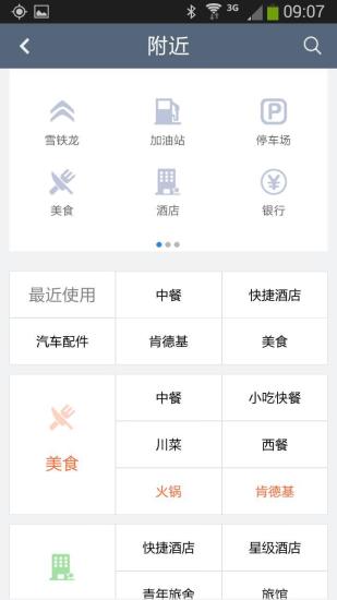 4. 目的地分类详尽,包含美食、加油站、停车场、银行、酒店等,查找目的地快速便捷。